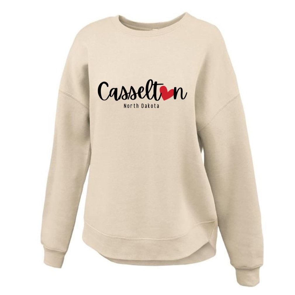 Demonstrate your town's pride with our Casselton Ladies Sweatshirt! This comfortable sweatshirt is designed with a curved bottom and a drop shoulder for a flattering fit. It features a rib waistband and cuff, and is made with a soft sponge fleece blend of 60% cotton and 40% polyester.