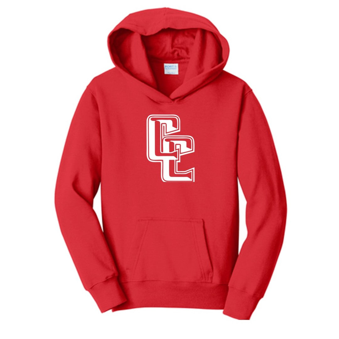 Highlighting high-quality materials, this red Central Cass youth hooded sweatshirt boasts an 80/20 ring spun cotton/poly blend. Experience ultimate comfort with a removable tag and twill-taped neck, all while sporting a stylish front pouch pocket.