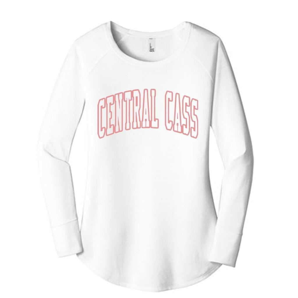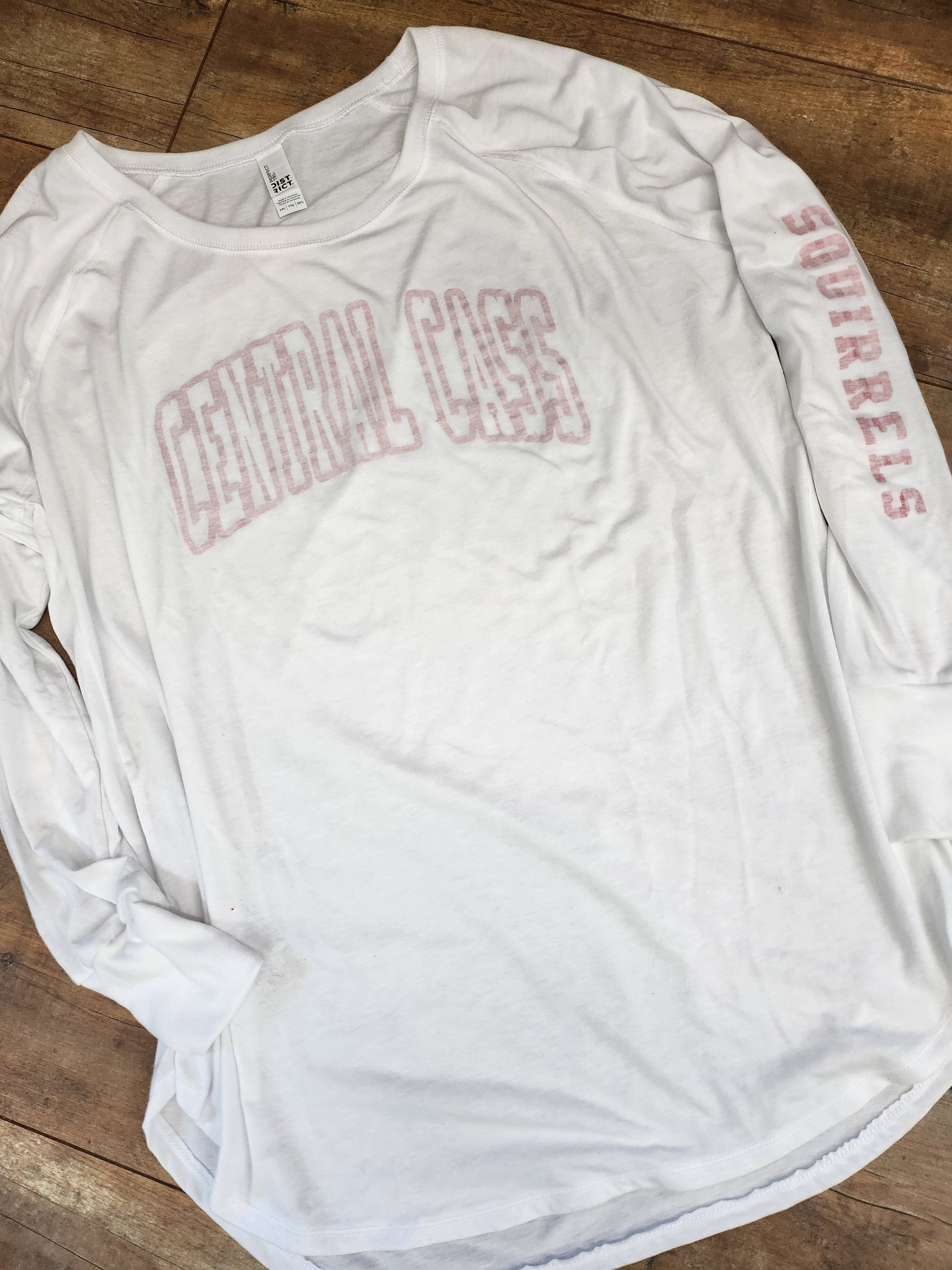 The new white inverted image is pressed onto the shirt from the inside to create a faded look. It features Central Cass across the front and Squirrels down the left arm. This is a long sleeve tunic version of our lightweight and soft crew, made with 4.5-ounce, 50/25/25 poly/combed ring spun cotton/rayon and 32 singles. Raw edge details at the armholes and coverstitch details add an extra touch of style. The 1x1 rib knit neck and rib knit elongated cuffs provide comfort. This shirt has a tear-away label, longer tunic length, curved hem, and runs small - we recommend sizing up.
